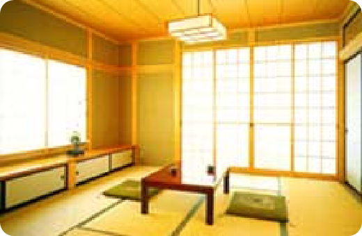 三層の切妻屋根に京外壁の真壁造り。土台にクリ、吉野杉の4寸柱、通し柱は6寸角、大黒柱にケヤキの8寸角と良材を惜しみなく使用しています。太鼓奥歯しらがある大広間は38畳の広さを誇ります。