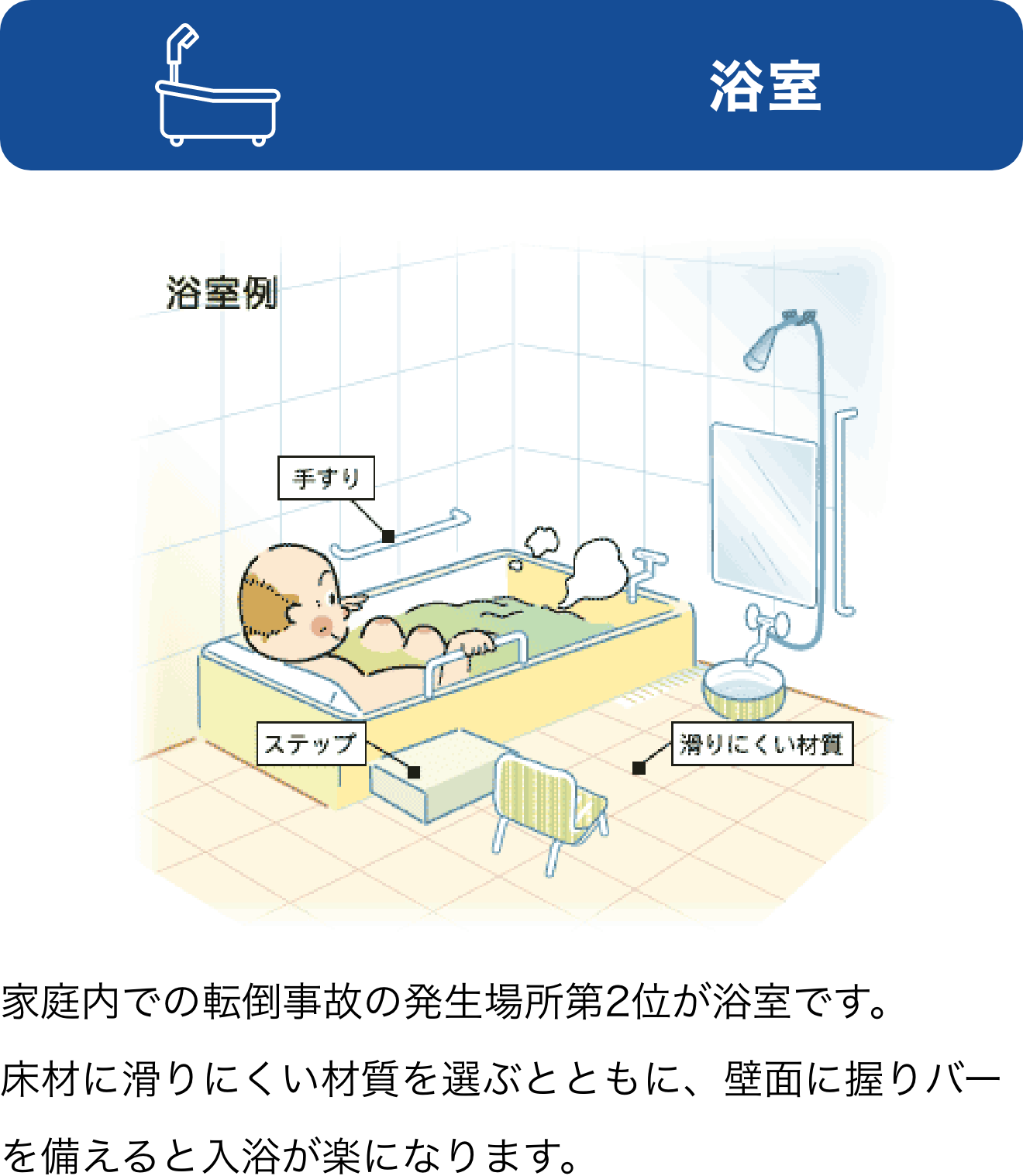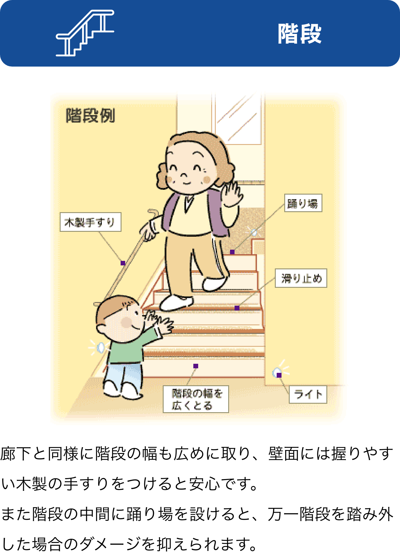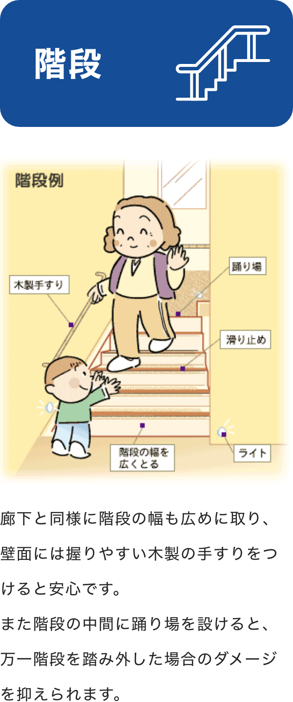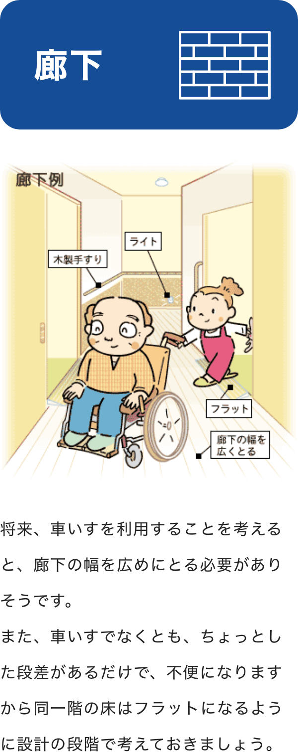 屋内の段差を少なくしたり、廊下を車いすが通れる幅にする、後から手すりが取り付けられる壁にしておくなど、建てる時に先々の配慮をしておくと、高齢者や小さな子供ばかりでなく家族が病気やケガをした時に役立ちます。
